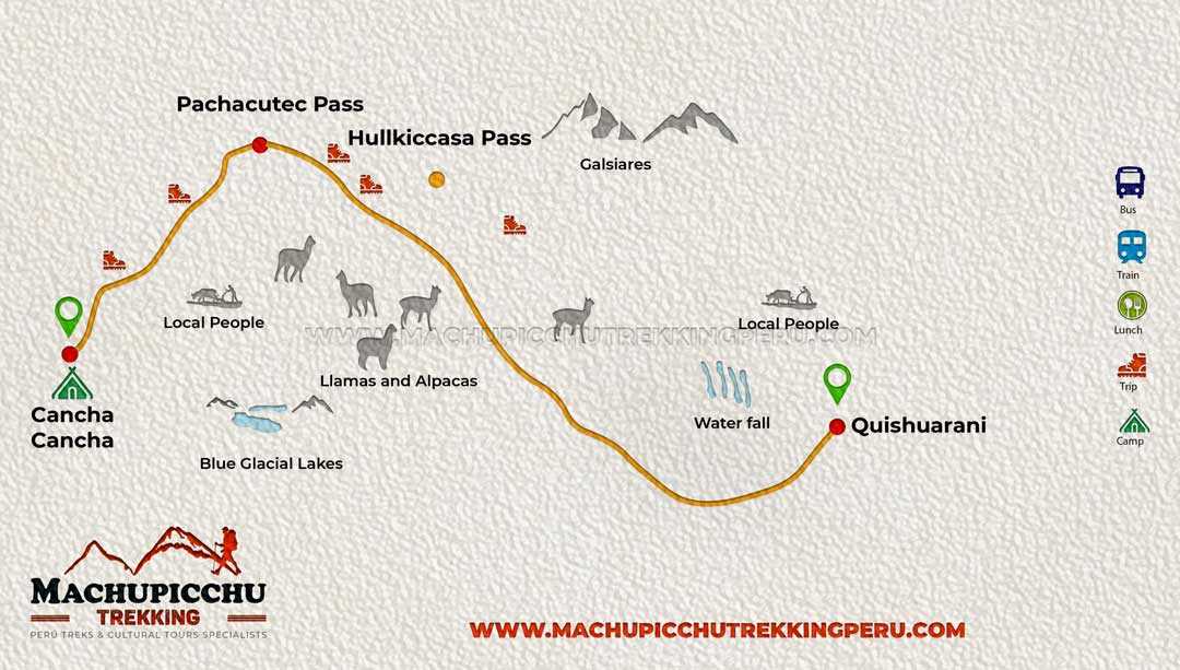 Cancha Cancha (3.900 m/12.800 pies) es una de las comunidades más aisladas y tradicionales, autosuficiente como lo ha sido durante cientos de años. No hay camino para llegar a la comunidad y recientemente se les conectó a la electricidad. Después de instalarse en sus tiendas de campaña y tomar el té de la tarde, tendrá la oportunidad de visitar a una familia local. Aprenderá todo sobre la vida en un pueblo andino tradicional, con su guía como intérprete. Después de la cena, su guía le mostrará las constelaciones incas de las que dependían para su orientación agrícola y todavía lo hacen hasta el día de hoy.